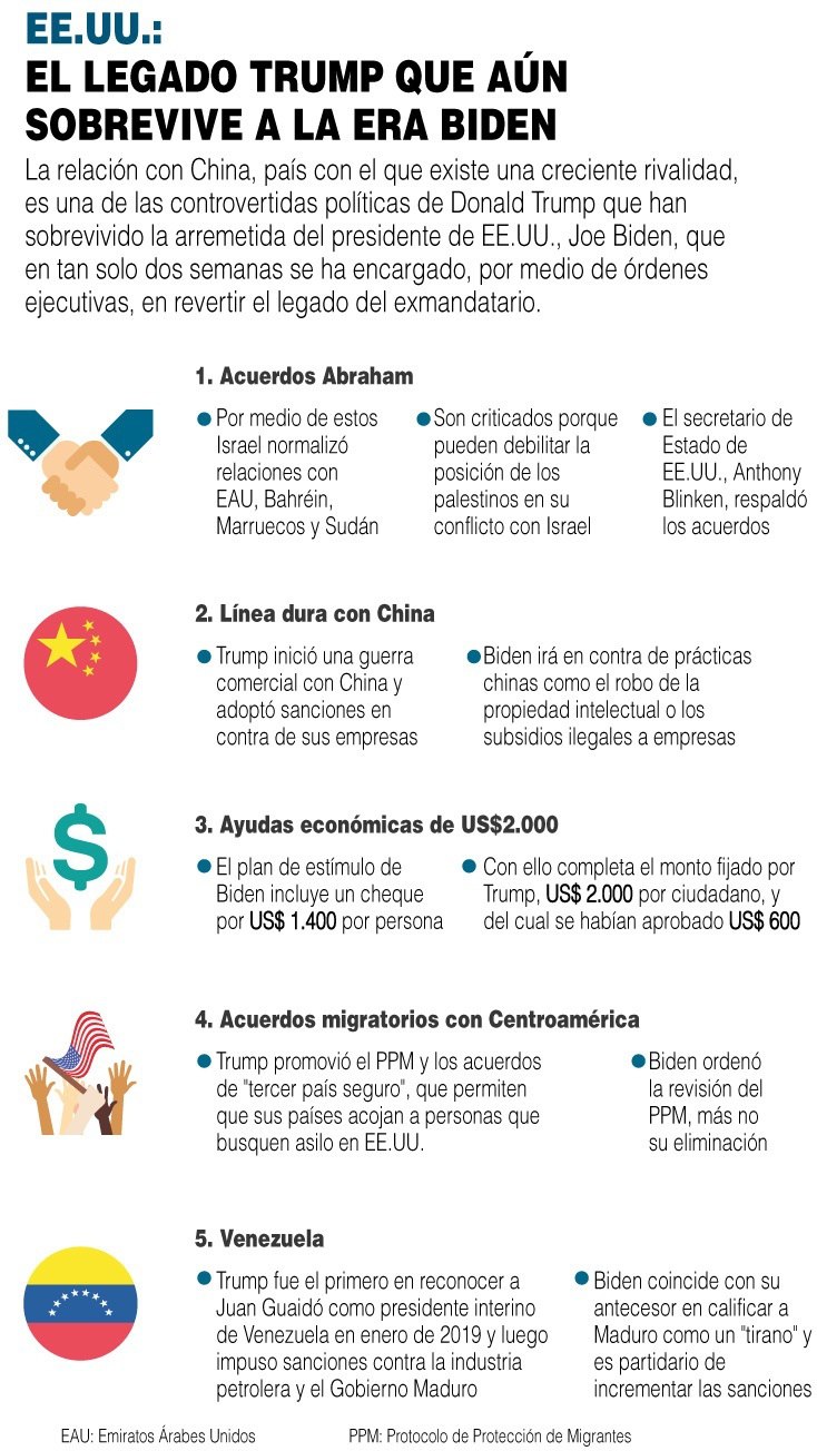 La relación con China, país con el que existe una creciente rivalidad, es una de las controvertidas políticas de Donald Trump que han sobrevivido la arremetida del presidente de EE.UU., Joe Biden, que en tan solo dos semanas se ha encargado, por medio de órdenes ejecutivas, de revertir el legado del exmandatario.