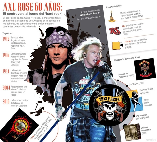 Axl Rose cumple 60. Tal vez el último rockstar de la vieja escuela. Una estrella modelada en otro tiempo, para otro tiempo.