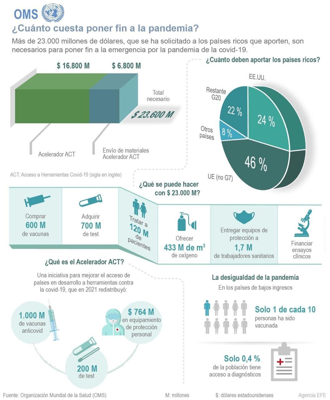 La Organización Mundial de la Salud (OMS) lanzó un llamamiento a los países desarrollados para que aporten 23.000 millones de dólares a la lucha global contra la COVID-19, una financiación con la que confía en «poner fin a la emergencia global por la pandemia en el 2022».