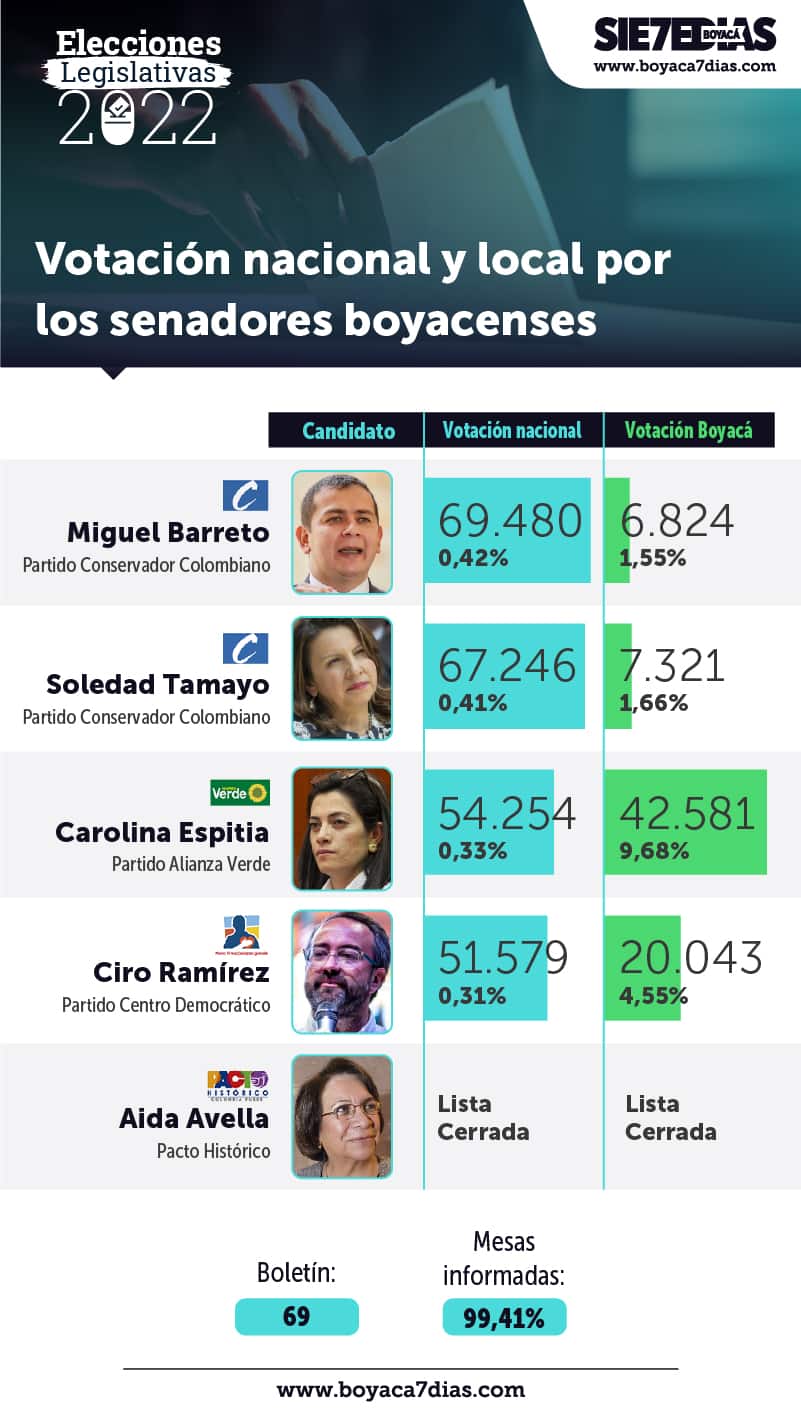 El nuevo Senado boyacense quedó conformado por Aída Yolanda Avella Esquivel, Miguel Ángel Barreto Castillo, Soledad Tamayo Tamayo, Ana Carolina Espitia Jerez y Ciro Alejandro Ramírez Cortés.