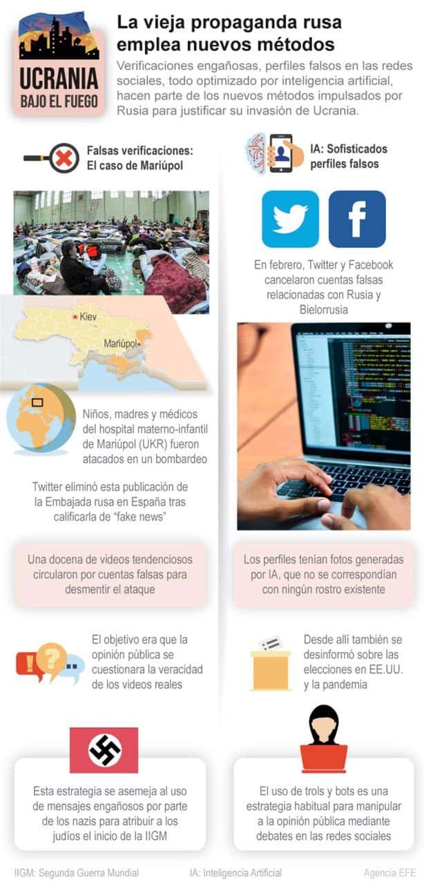 Nuevos métodos y propaganda clásica se mezclan en el torrente de desinformación impulsado por Rusia para justificar su invasión de Ucrania, con el uso de verificaciones engañosas y la creación de perfiles falsos en las redes sociales, mejorados gracias a la inteligencia artificial.