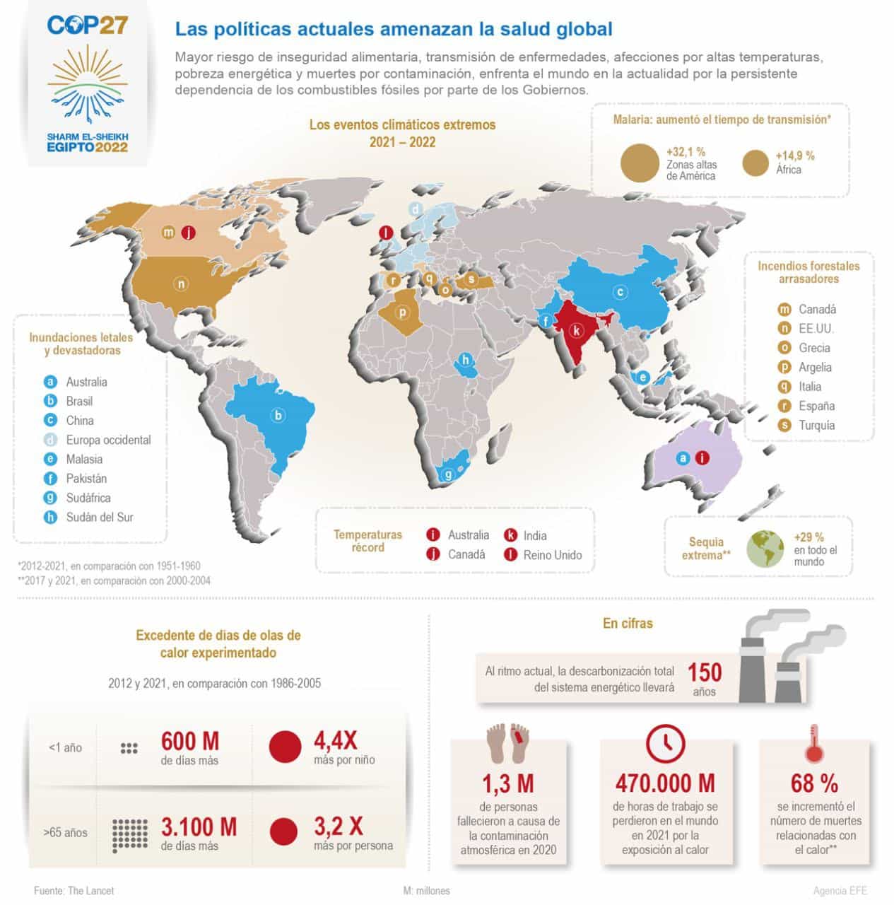 Mayor riesgo de inseguridad alimentaria, transmisión de enfermedades, afecciones por altas temperaturas, pobreza energética y muertes por contaminación, enfrenta el mundo en la actualidad por la persistente dependencia de los combustibles fósiles por parte de los Gobiernos. EFE