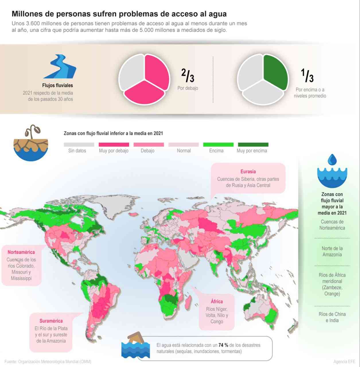 El informe, primero que la OMM dedica específicamente a los recursos hídricos, destaca que en el 2021 dos tercios de la superficie terrestre tuvieron flujos fluviales por debajo de la media de los pasados 30 años, mientras que solo un tercio estuvo por encima o a niveles promedio.