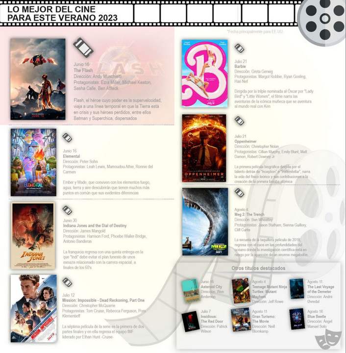 ‘The Flash’, ‘Indiana Jones and the dial of destiny’, ‘Mission: impossible – dead reckoning, part one’ y ‘Barbie’, entre otras, son las películas más esperadas para este verano. Encuentre aquí la relación y ficha técnica de los filmes más sonados para este verano. EFE