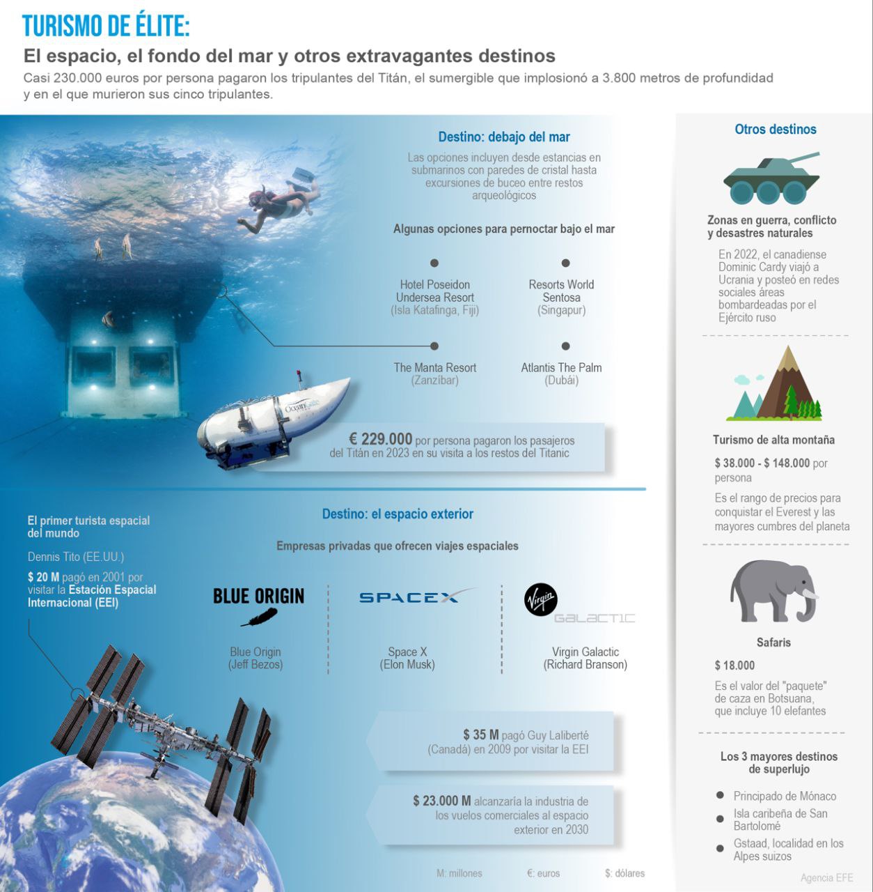 Casi 230.000 euros por persona pagaron los tripulantes del Titán, el sumergible que implosionó a 3.800 metros de profundidad en su visita a las ruinas del Titanic, una catástrofe producto de una nueva tendencia: el turismo de élite, en el que los nuevos destinos son las profundidades del océano, el espacio y hasta las zonas en conflicto. EFE