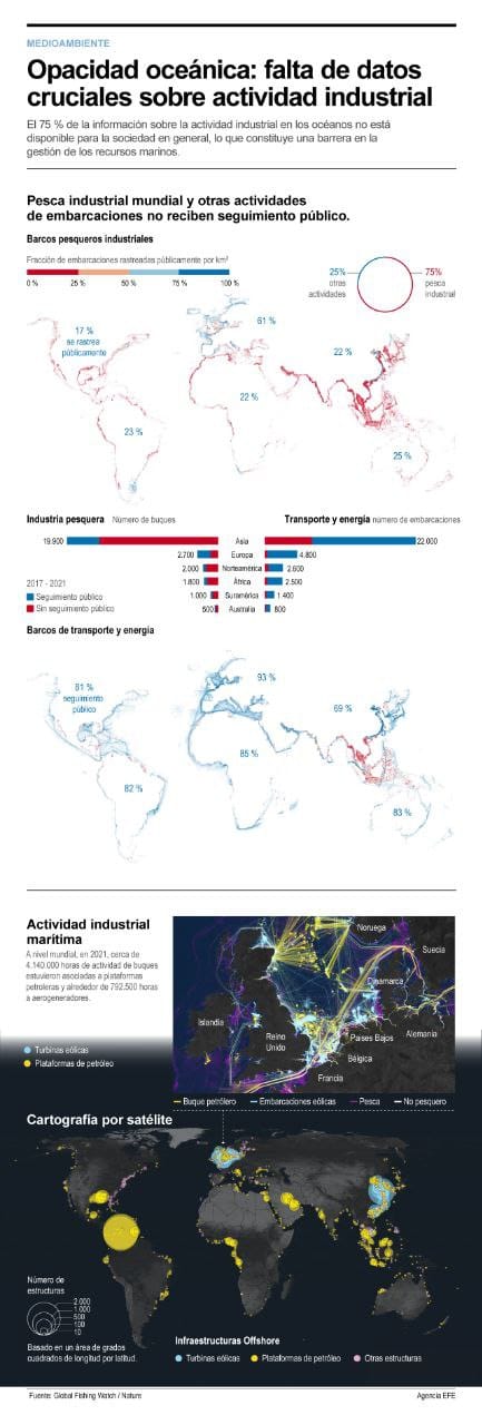 El 75 % de la información sobre la actividad industrial en los océanos no está disponible para la sociedad en general, según revela la organización de Global Fishing Watch, que ha empleado tecnología satelital e inteligencia artificial para cartografiar la actividad humana en los mares. EFE
