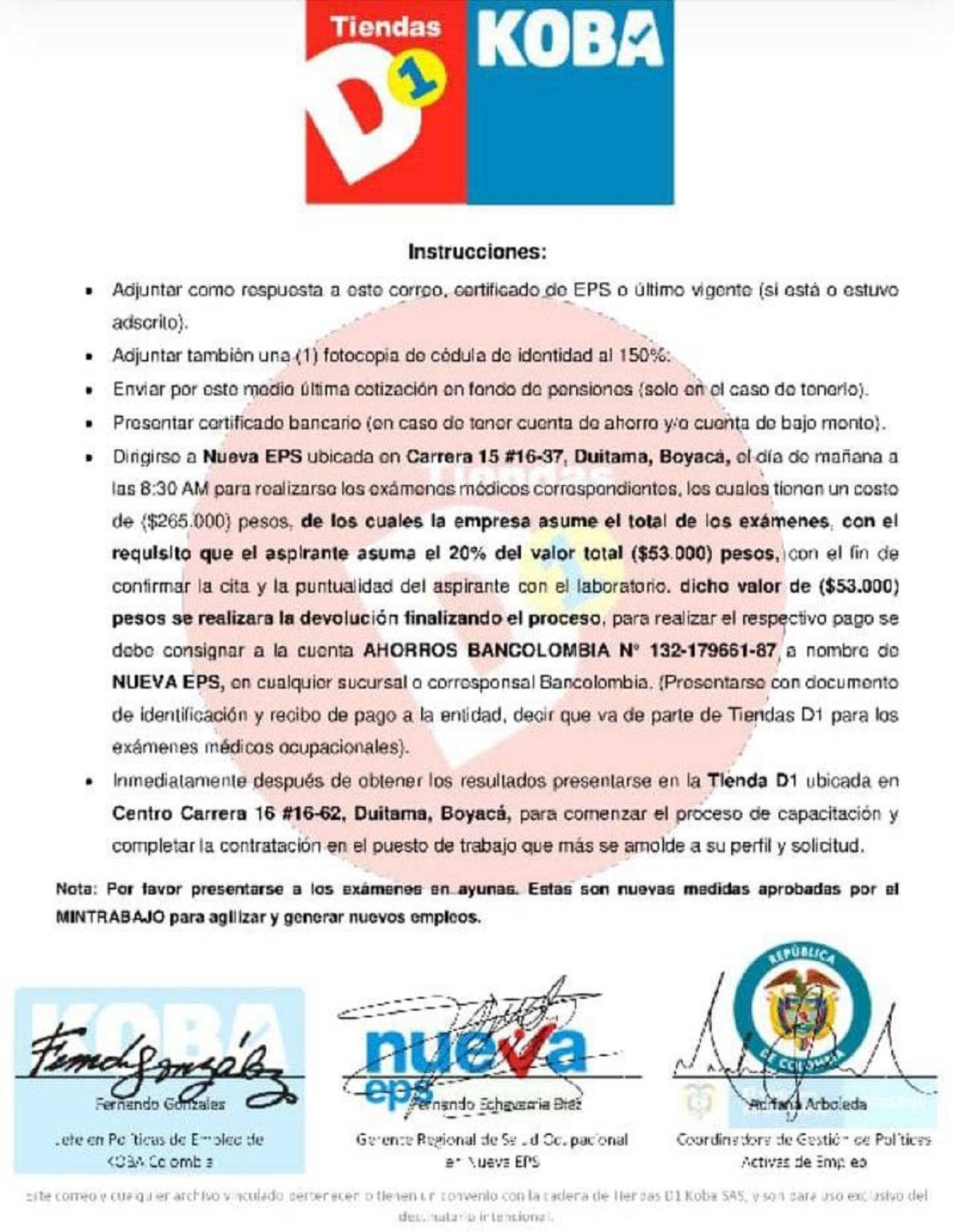 • Nueva EPS no realiza exámenes médicos de ingreso, ni solicita que se realice ningún tipo de consignaciones para el acceso de los servicios o convocatorias laborales.