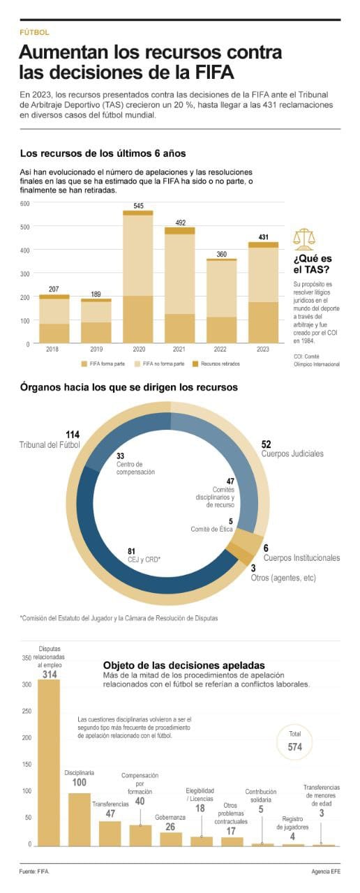 En el 2023, los recursos presentados contra las decisiones de la FIFA ante el Tribunal de Arbitraje Deportivo (TAS) crecieron un 20 %, hasta llegar a las 431 reclamaciones en diversos casos del fútbol mundial. EFE