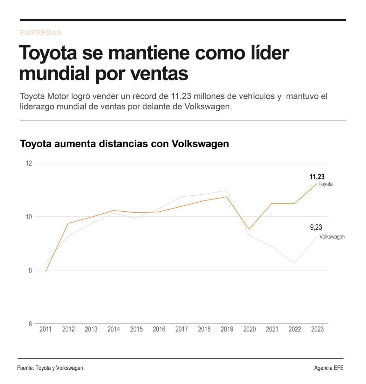 Volkswagen, su rival alemán, vendió 9,24 millones de vehículos en ese año, mientras que el anterior récord de Toyota se situaba en 10,74 millones en 2019.