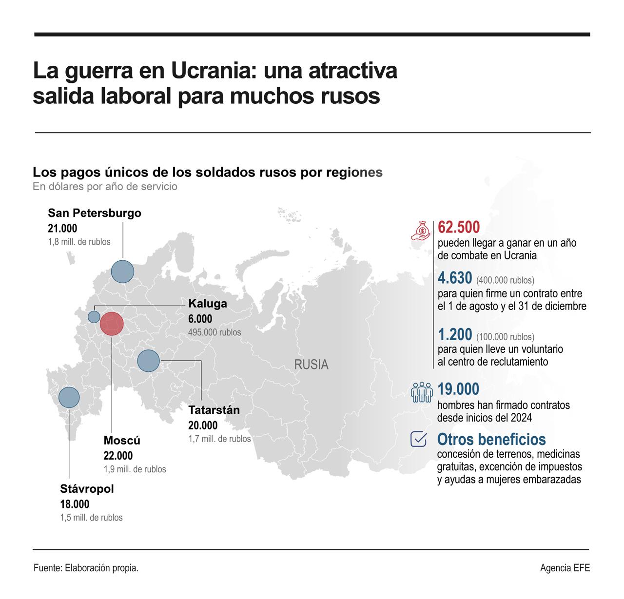 [Infografía] El Kremlin convierte la guerra en una atractiva salida laboral para muchos rusos