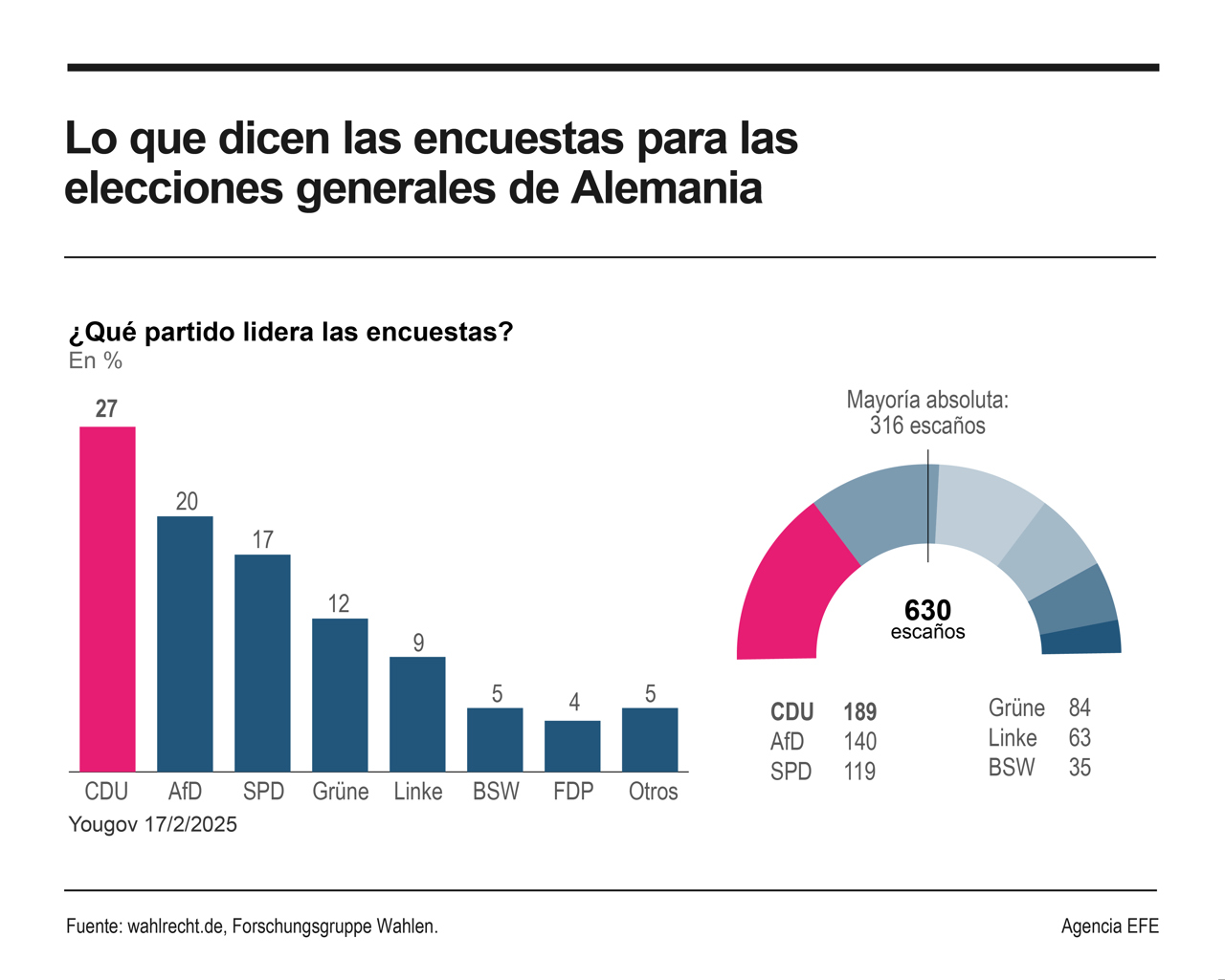 A cuatro días de las elecciones, el pronóstico es que el bloque conservador (CDU-CSU) venza con entre un 29 % y un 31 %, seguido por la utraderechista Alternativa para Alemania (AfD), que, con un 20 %-22 %, duplicaría sus resultados de 2021, y por los socialdemócratas del canciller Olaf Scholz, que caerían casi 10 puntos hasta un 15 % ó 16 %.