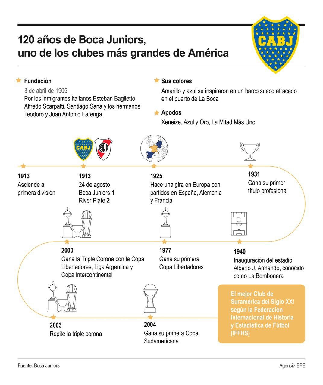 Boca Juniors celebra este jueves 120 años desde su fundación, a cargo de cinco jóvenes inmigrantes genoveses que escribieron en un parque la primera página de una historia marcada por la pasión y el éxito y que contrasta con el presente del club, que en el 2025 no tendrá competición internacional.
