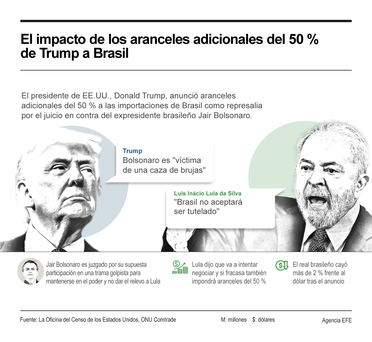 El presidente de Estados Unidos, Donald Trump, anunció la imposición de un arancel del 50 % a las importaciones de Brasil en represalia por el proceso judicial contra el expresidente brasileño Jair Bolsonaro, una medida que el presidente Luiz Inácio Lula da Silva ha rechazado replicando que su país «no aceptará ser tutelado por nadie».