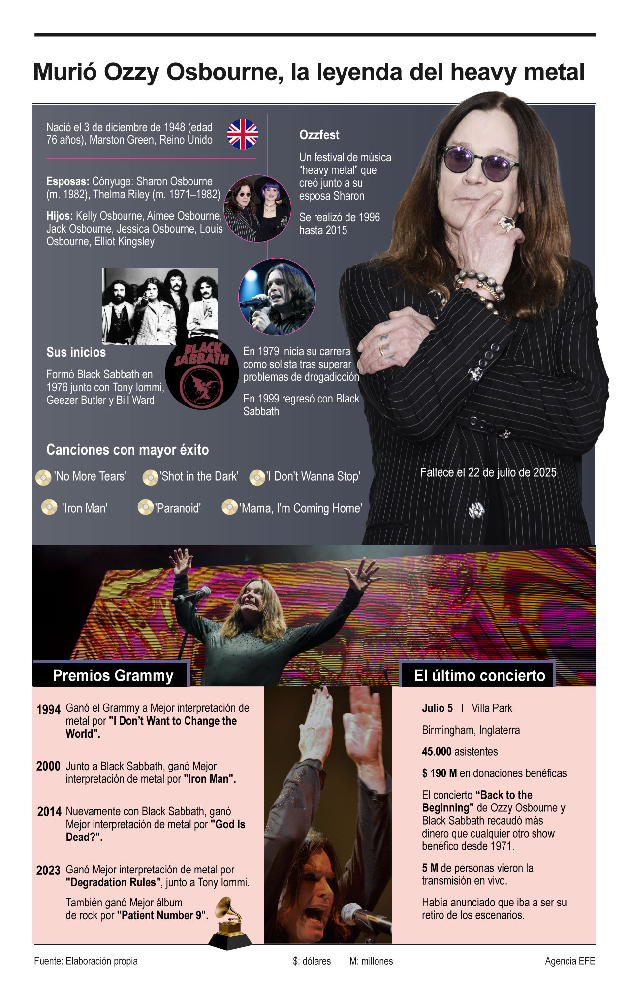 El autoproclamado ‘Príncipe de las Tinieblas’, que fue diagnosticado con la enfermedad de Parkinson en el 2019, dio su último concierto con la banda a principios de este mes en Birmingham (centro de Inglaterra), cerca de donde nació, en el que estuvo acompañado de otras estrellas de la música.