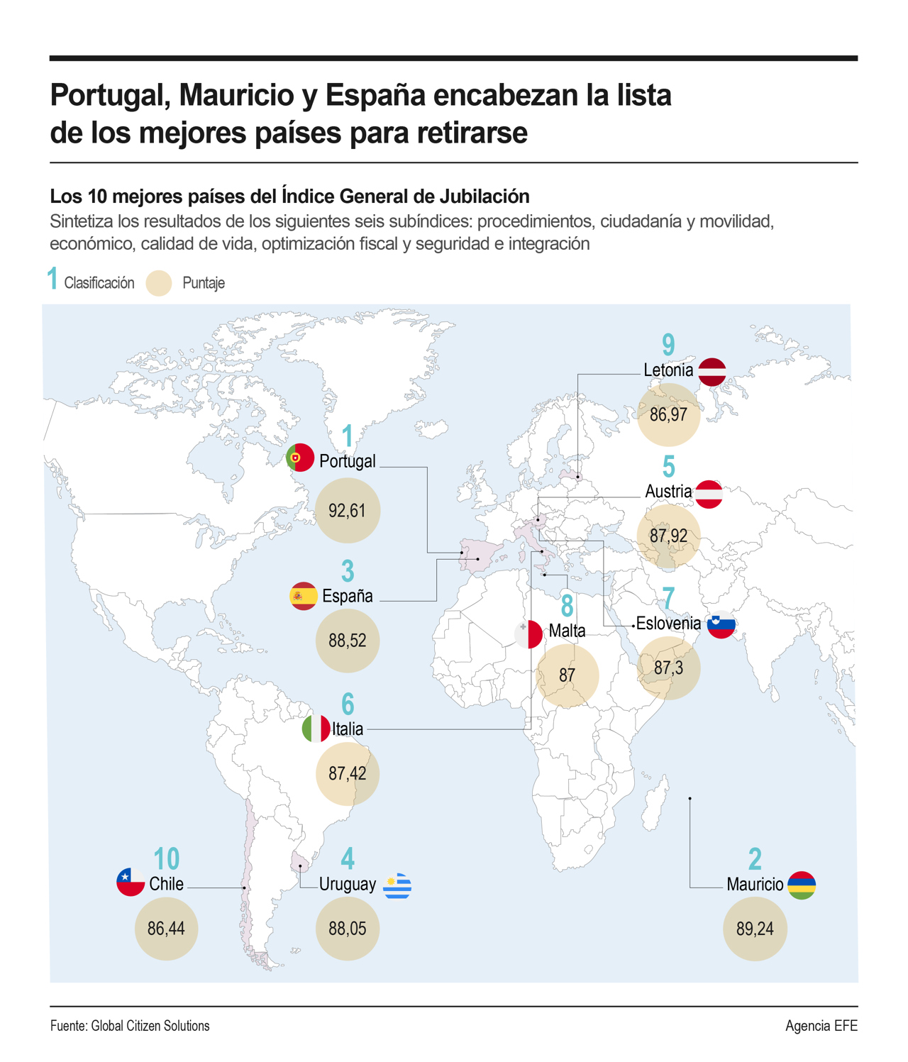 Portugal, Mauricio y España encabezan la lista de los mejores países para retirarse, de acuerdo con un reporte de la firma consultora especializada en migración Global Citizen Solutions. EFE