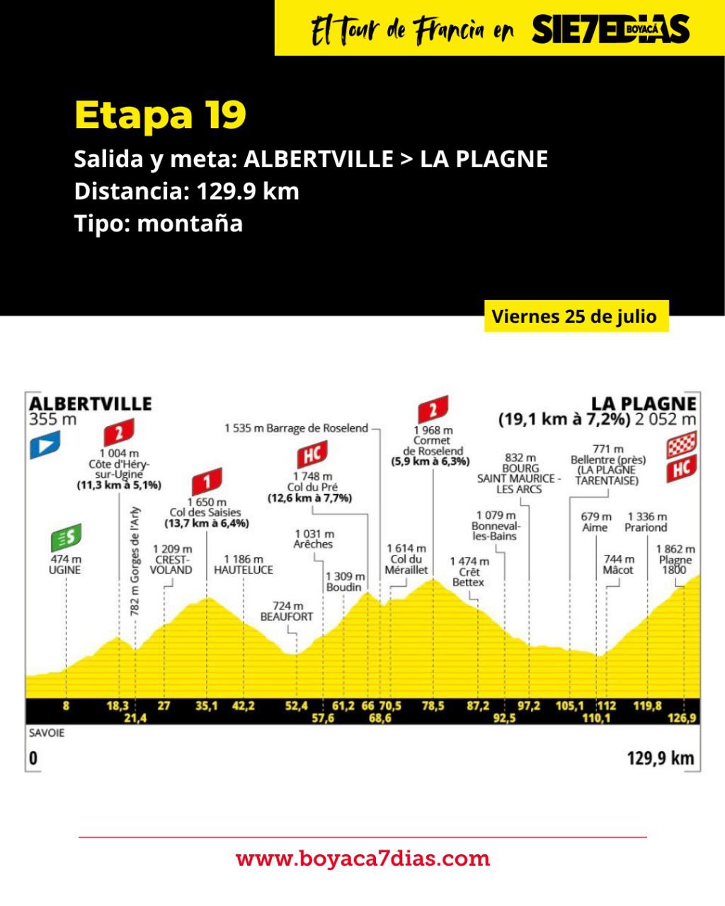 La sentencia se dictará en La Plagne, con un ascenso de 19,1 kilómetros al 7,2 % que sube por encima de los 2.000 metros sobre el nivel del mar. Un final en alto que regresa al Tour por primera vez desde el 2002 y que, por su dureza y altitud, servirá de juez final para las ambiciones en los Alpes.