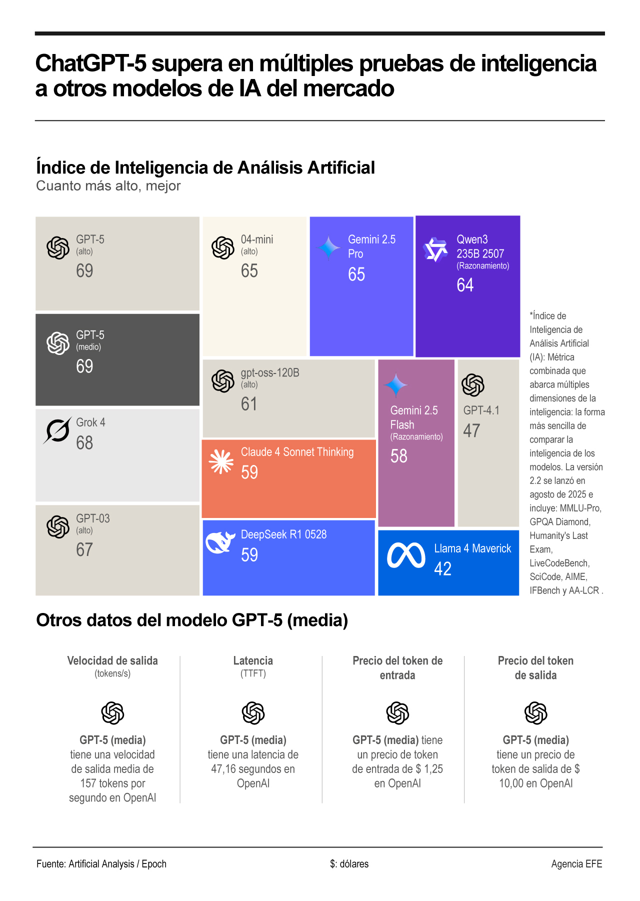 ChatGPT 5, lanzado recientemente y con más de 700 millones de usuarios, destaca por su índice de inteligencia y capacidad para resolver problemas matemáticos de nivel experto, superando a Claude, Gemini, Grok y DeepSeek. EFE