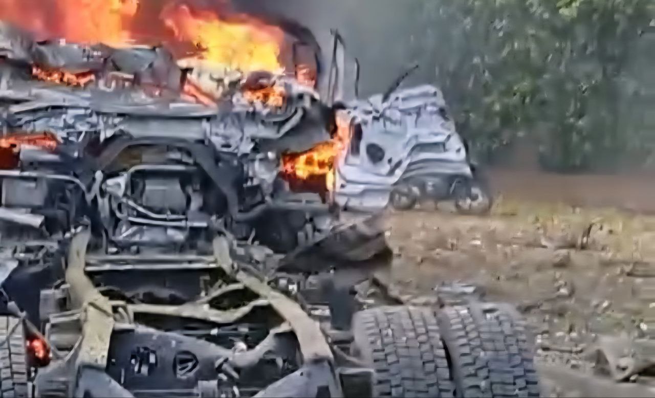 También se ve un camión incendiado, que al parecer estaba cargado de explosivos; varios vehículos completamente destruidos por la explosión, y la fachada de un supermercado caída.
