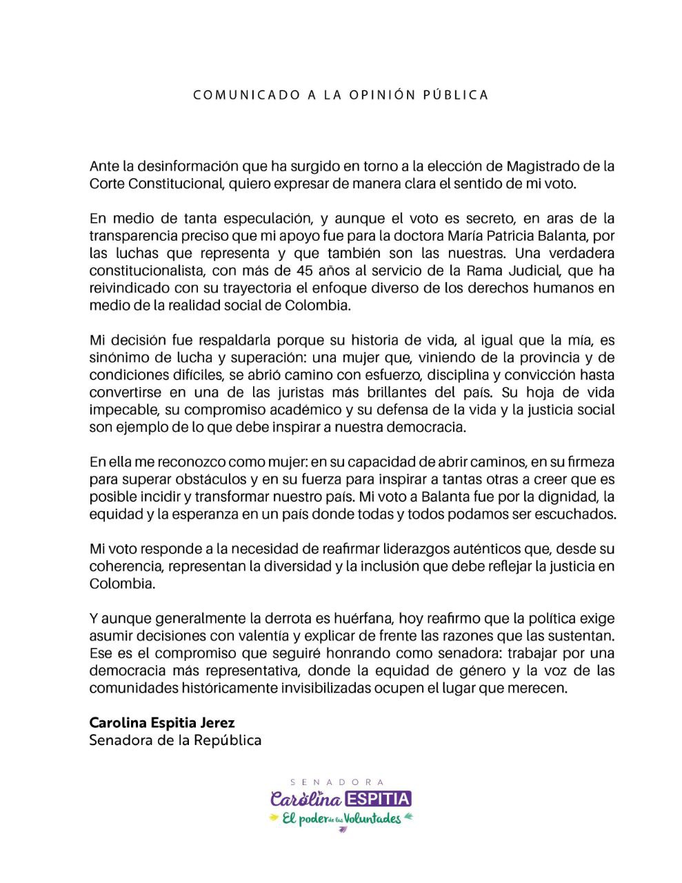 Sin embargo, en la madrugada de hoy Carolina Espitia publicó un comunicado a través de sus redes sociales, en el que afirma: “Ante la desinformación que ha surgido en torno a la elección de magistrado de la Corte Constitucional, quiero expresar de manera clara el sentido de mi voto”.