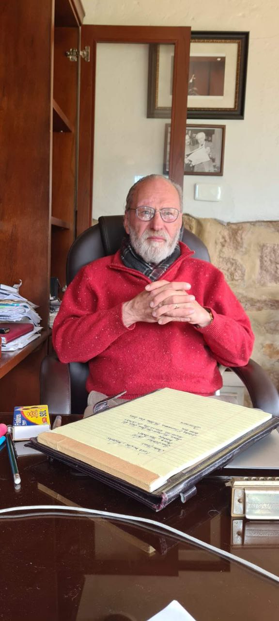 Dos han sido las veces en que he sostenido largas conversaciones con él. La primera fue el sábado 12 de junio de 2021 en su casa de Villa de Leyva, cuando acudí para comentarle mi interés en elaborarle un perfil. La segunda ocurrió el sábado 10 de julio del mismo año. En esta me recibió por varias horas. En el estudio me contó su vida, me mostró la pipa que ha utilizado desde joven e interpretó unos acordes en la armónica que su abuelo trajo de Francia y que guarda como una joya.
