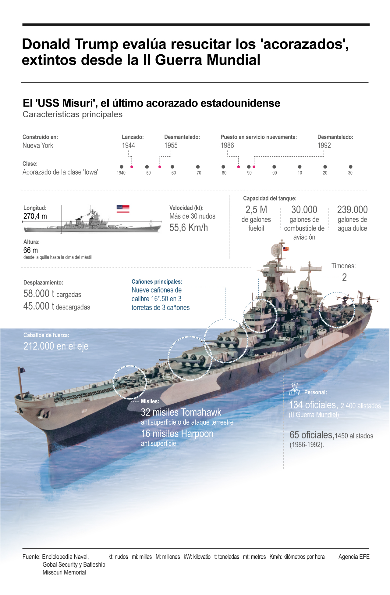 «Creo que deberíamos comenzar a pensar en los acorazados (…) Cuando veo a esos navíos que iban acompañados por destructores. No había nada que los pudiera detener (…) Algunos dirán que es tecnología obsoleta. Pero, no sé. (…) Es algo que estamos, de hecho, considerando», aseguró Trump frente a una inusual congregación de generales, a los que ya había advertido que «si no son verdaderos guerreros», los despedirá.
