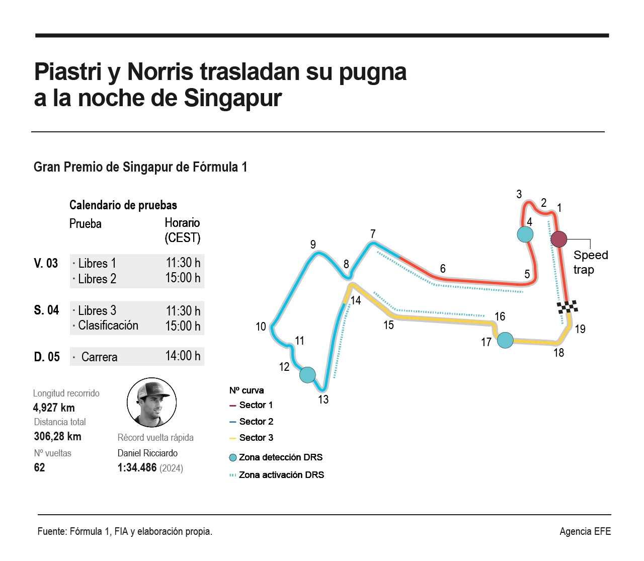 El australiano Oscar Piastri (McLaren), líder del campeonato, y su compañero, el inglés Lando Norris -segundo en el certamen, a 25 puntos-, retomarán su pugna por el título este fin de semana en el Gran Premio de Singapur, el decimoctavo del Mundial de Fórmula Uno, la muy exigente prueba nocturna que se disputará en el circuito urbano de Marina Bay.