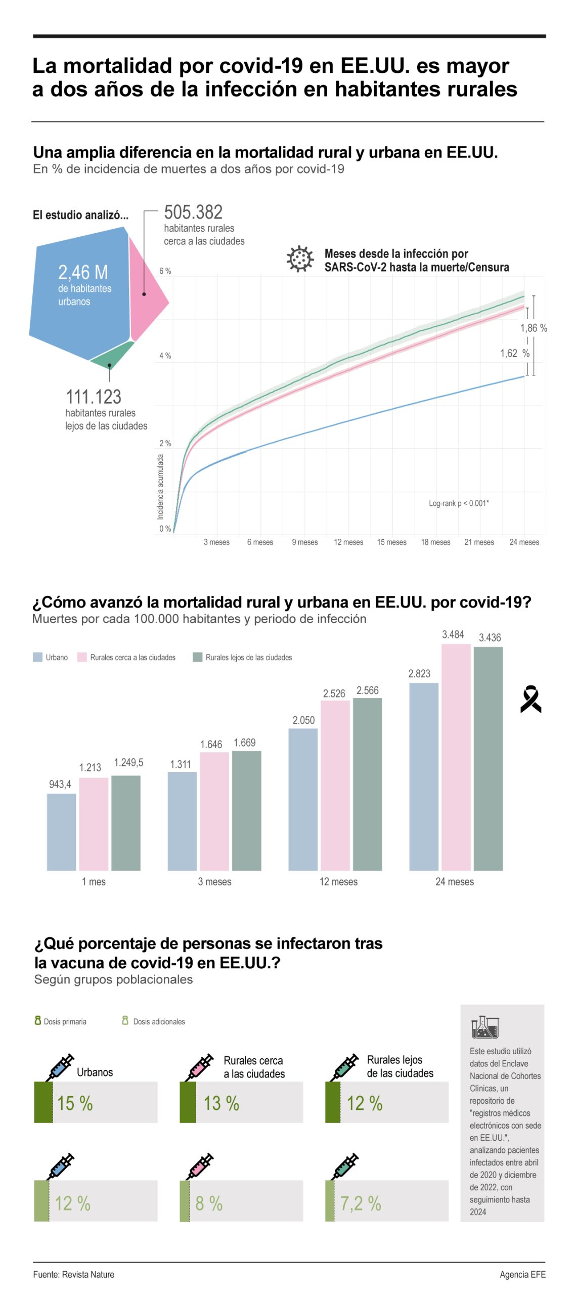 La mortalidad por la COVID-19 pasados dos años de la infección es mucho mayor en habitantes rurales que urbanos de Estados Unidos, según un estudio publicado en la Revista Nature, que calculó una diferencia del 1,62 % en la mortalidad entre habitantes urbanos y rurales cercanos a las ciudades, y del 1,86 % frente a los habitantes rurales que están lejos de cascos urbanos. EFE