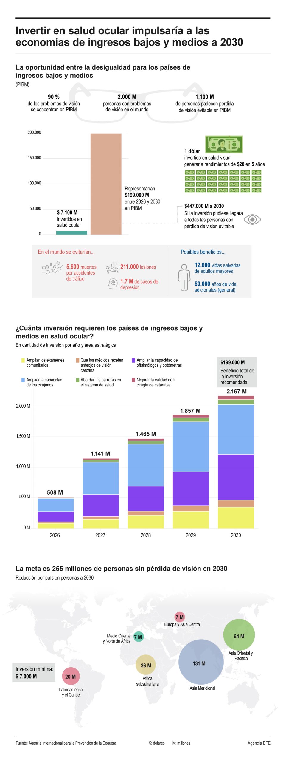 Una inversión de 7.000 millones de dólares en la salud visual en países de ingresos bajos y medios podría representar entre el 2026 y el 2030 un rendimiento de 199.000 millones de dólares, al impactar significativamente en la capacidad de desarrollo de estas naciones que concentran el 90 % de las personas con problemas de visión, según el informe ‘El valor de la visión’ de la Agencia Internacional para la Prevención de la Ceguera. EFE