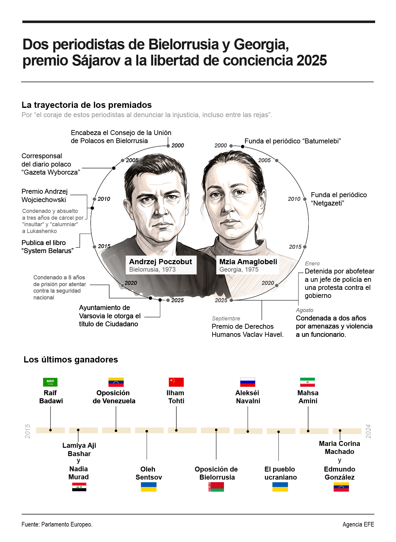 Poczobut es un periodista y ensayista bielorruso conocido por sus críticas al régimen de Alexander Lukashenko y en el 2021 fue sentenciado a ocho años de prisión, mientras que Amaglobeli fue detenida en el 2025 por participar en protestas antigubernamentales y fue condenada a dos años de prisión.