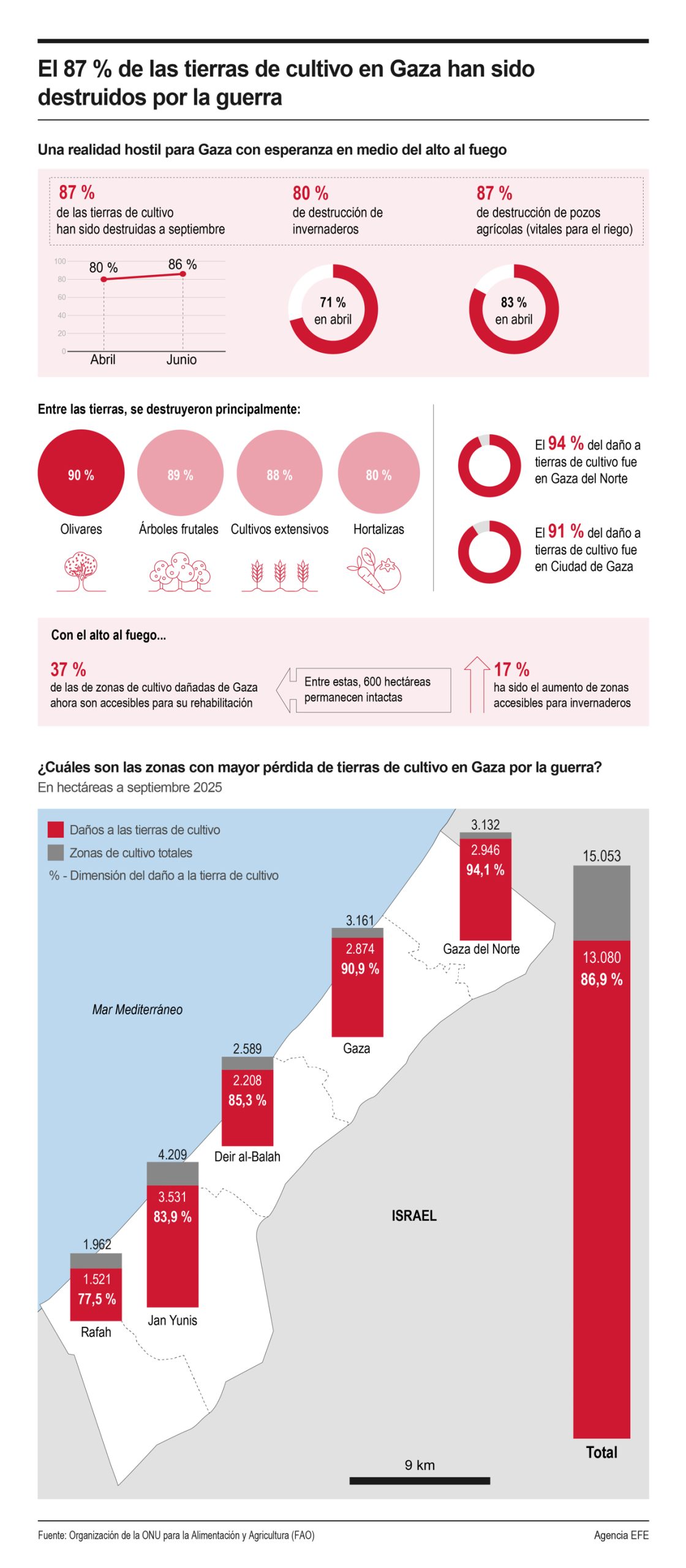 El 87 % de las tierras de cultivo de la Franja de Gaza han resultado dañadas durante la guerra, según un informe de la Organización de las Naciones Unidas para la Alimentación y la Agricultura (FAO), que destaca la necesidad de aprovechar que tras el alto al fuego se han vuelto accesibles para su rehabilitación un 37 % de esos territorios dañados. EFE