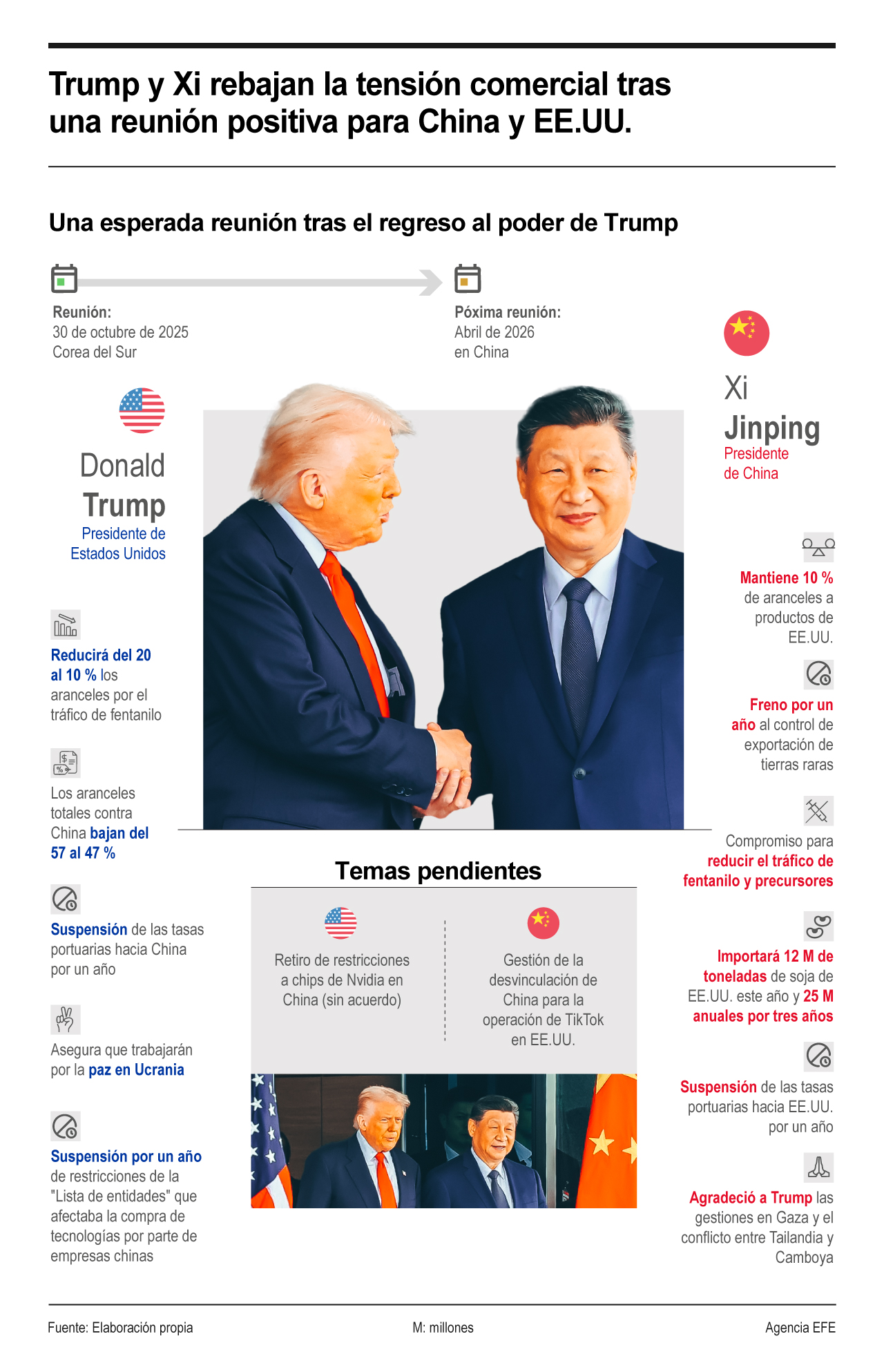 Los presidentes de Estados Unidos, Donald Trump, y de China, Xi Jinping, alcanzaron una serie de acuerdos orientados a desescalar las tensiones comerciales, que incluyen reducciones de aranceles, el levantamiento de restricciones a la exportación de tierras raras chinas, la reanudación de las compras de soja estadounidense y la suspensión de varias sanciones, entre otras medidas. EFE
