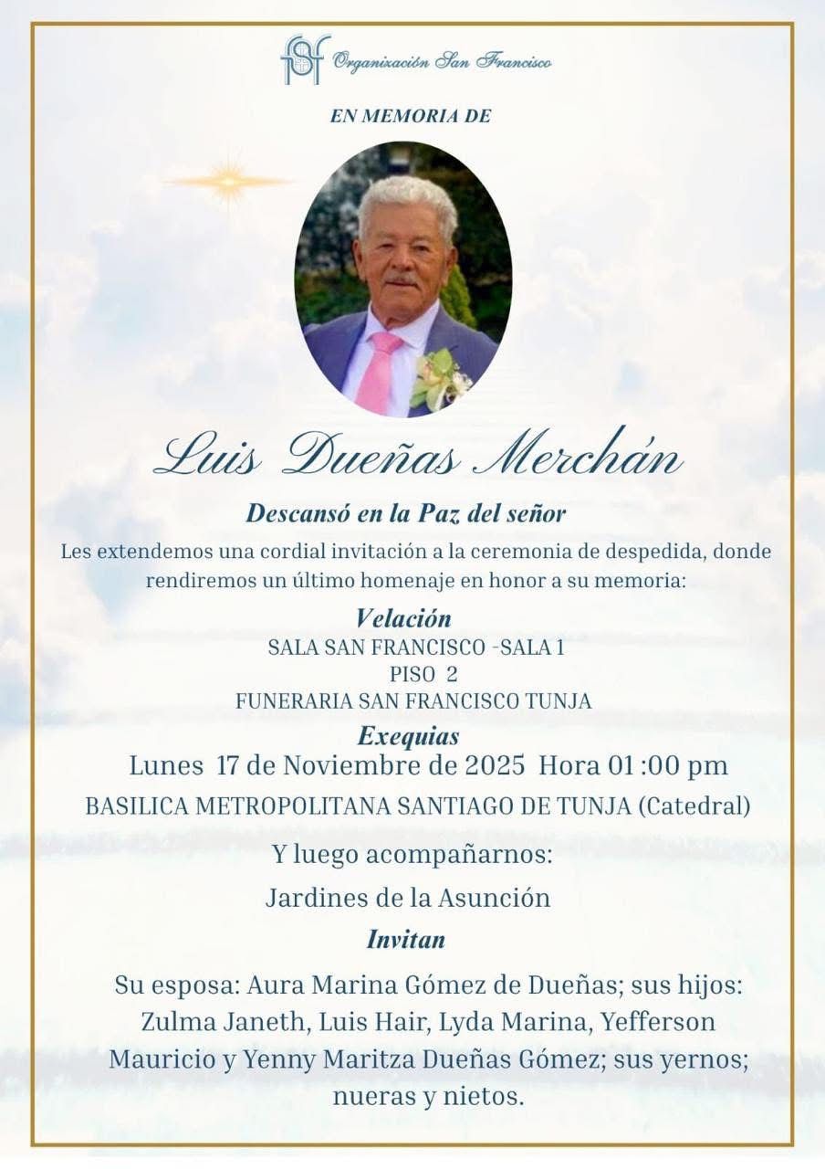 Aviso: Exequias Luis Dueñas Merchán 16/11/2025 Con profundo amor despedimos al Esposo, padre, abuelo y amigo. Luis Dueñas Merchán quien deja un legado de bondad y cariño en nuestros corazones.Sus exequias se realizarán el día lunes 17 en la catedral de Tunja a la 1: 00 p.m.