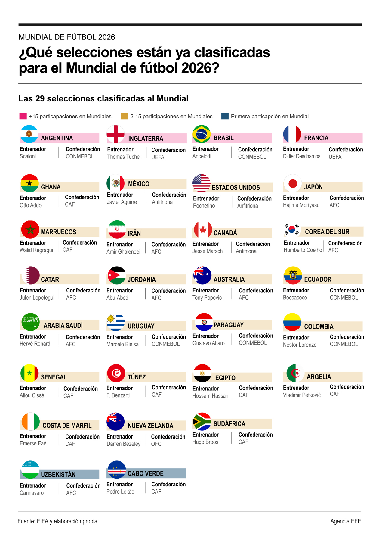 Treinta de las 48 plazas del Mundial 2026 están ya confirmadas. Son las siguientes: