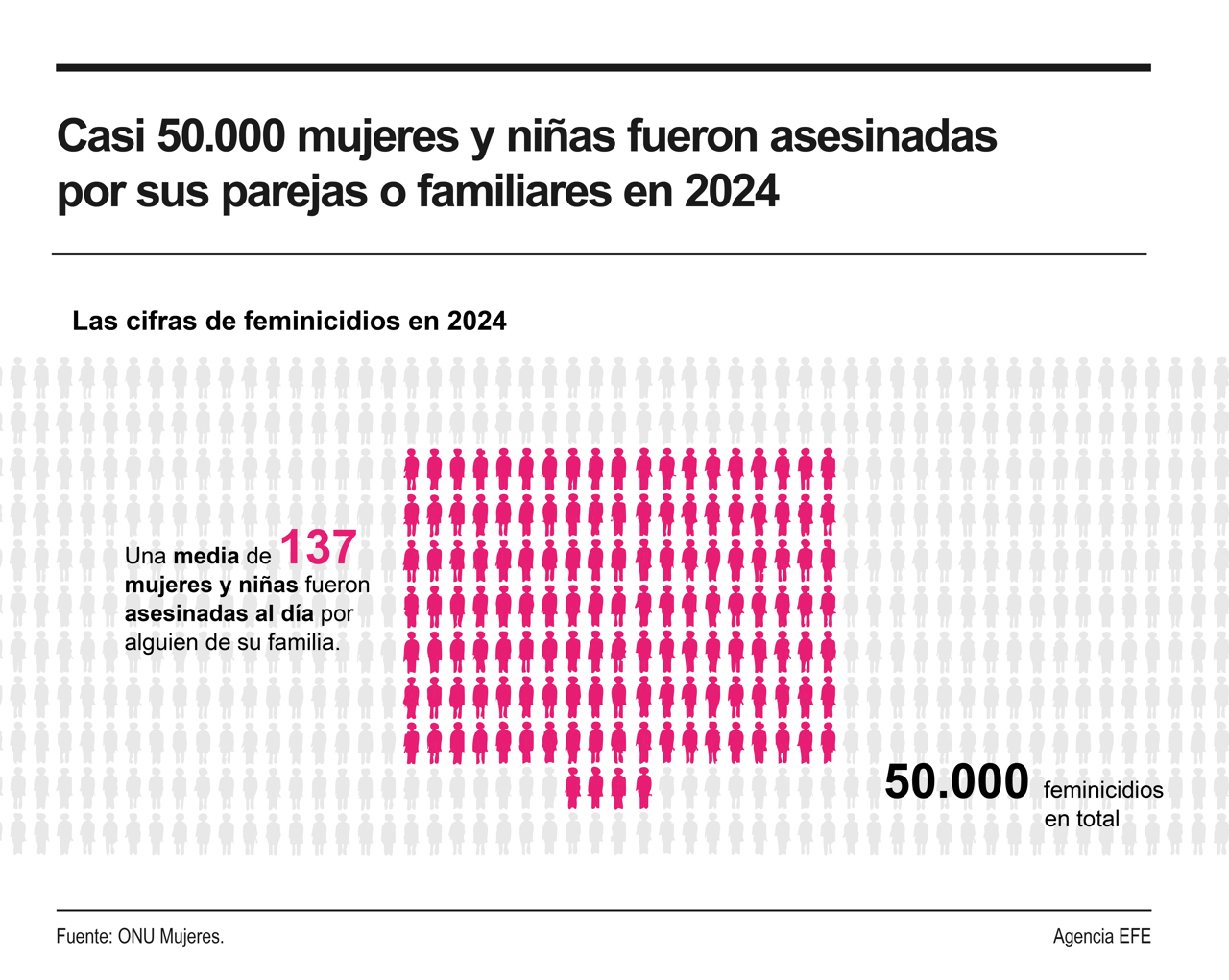 El nuevo informe sobre feminicidios de la Oficina de Naciones Unidas contra la Droga y el Delito (ONUDD) y de ONU Mujeres señala que en el 2024 casi 50.000 mujeres y niñas fueron asesinadas por sus parejas o por familiares cercanos en todas las regiones del mundo.