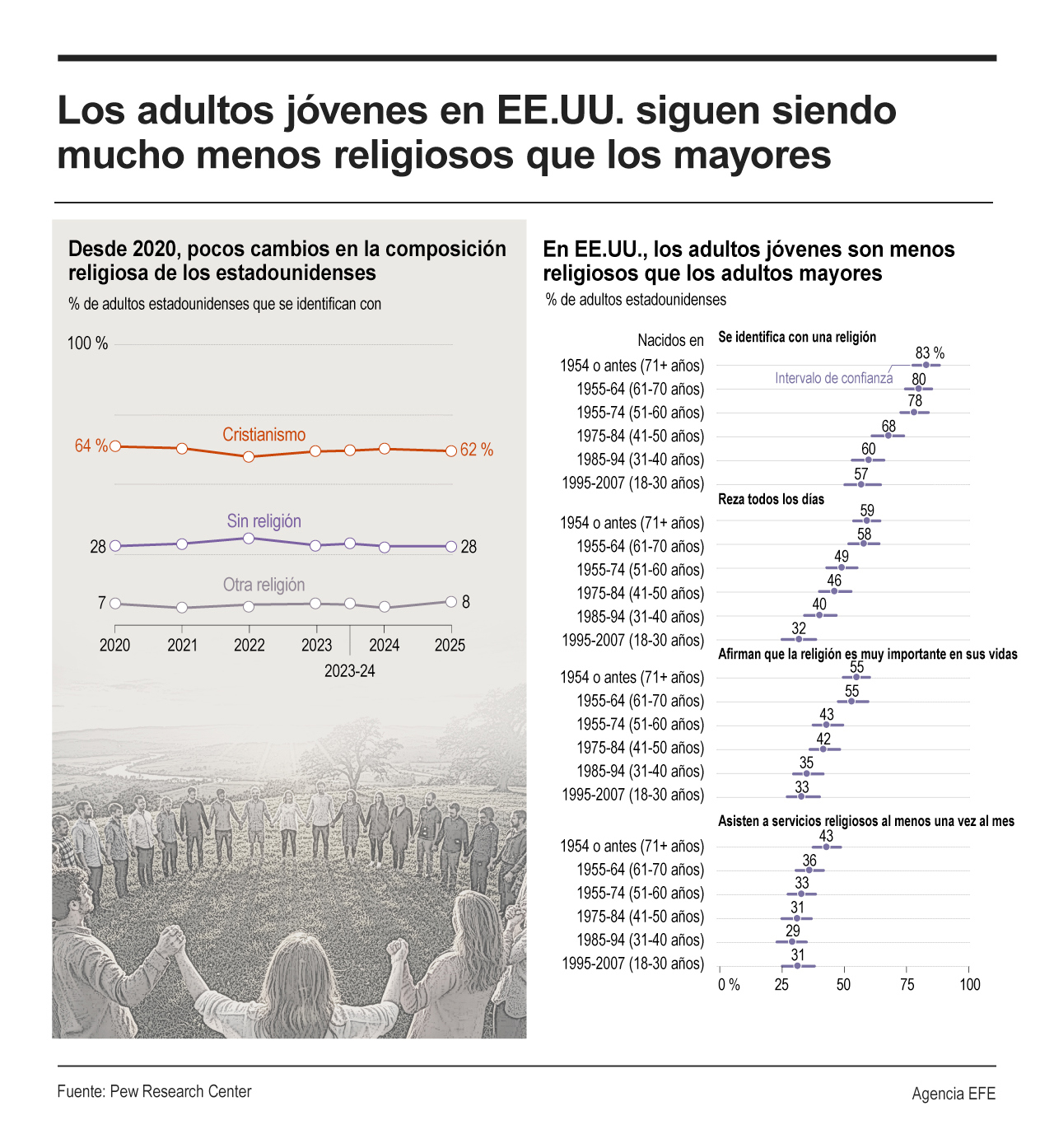 Los adultos jóvenes siguen siendo mucho menos religiosos que los estadounidenses mayores, y también son menos religiosos que los de hace una década, según una encuesta del Pew Research Center. EFE